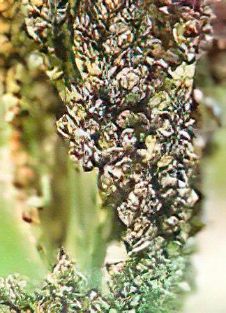 病徵:彎刀菌:感病後在穀粒上呈現褐色或黑色之壞疽,氣候潮濕時,穀粒上佈滿黑色絨毛狀菌絲及孢子。