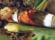 本病主要危害成熟蔗莖,病原菌由螟害等傷口侵入,被害莖節間內部組織呈現紅色程度濃淡不一、形狀大小不定之塊斑,而其間襯有白色橫斑為其特徵,可與其他原因之蔗莖赤變區別。被害嚴重時病斑佈滿節間全部甚或通過節部而延長數節間。本病亦發生於葉片與葉鞘,葉片於中肋產生周圍暗紅色、中央灰白色長度不一之條斑,後期於其上散生黑色小點,為分生孢子群;葉鞘則散生周圍紅色、中央暗褐色形狀不規則之塊斑,可互相連合成大病斑,由葉鞘內側觀察時病斑周圍呈朱紅色,中央黑褐色並略凹陷,其上亦散生黑色小點。