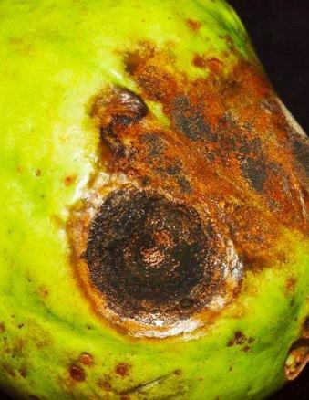 病徵:初感染時病斑圓形,略有突起,病斑表面粗糙有裂紋,如瘡痂狀,褐色,邊緣為淡褐或土黃色澤,大小約2~4公厘,病斑中央具黑色的環型小點,黑色小點頂部會釋出黑色粉末或彎曲柱狀物,係病原菌的柄子殼及柄孢子,病斑凹陷時邊緣與健康部位的組織表皮會分離,病斑並不脫落。果肉組織會出現兩種病徵,一即果肉軟化,水浸狀,果肉色澤轉呈橘黃色或紫黃色;二即果肉木栓黃褐色,不會軟化或水浸狀,常伴隨果實缺鈣現象,缺鈣時,在果實中央外側附近表皮會出現褐化,漸形成一個橫帶區域或一個環斑,果實因而提早衰弱老化。