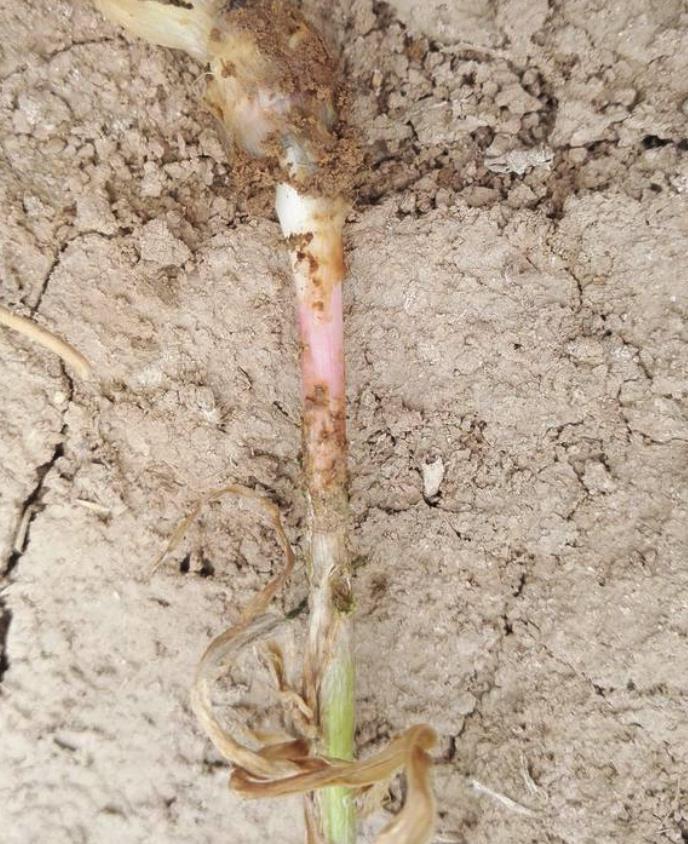 大蒜莖基部罹病部位初呈暗綠色水浸狀,病斑逐漸擴展至葉片呈褐色水浸狀,嚴重時組織軟化腐爛,造成植株倒伏和黃化萎凋,腐爛後且發出惡臭。