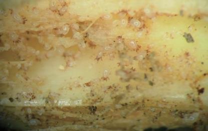 危害狀:以韭之地下根為主要寄主,植株被害後,受害株因失去根部,無法吸收水份而衰弱,被害株之新葉細短而扭曲不平,老葉枯死,植株縮小,最後死亡,如果其危害再伴隨傳播之植物病害,則加速植株死亡,田間危害嚴重時常導致嚴重缺株,產量及品質受影響至鉅。在高溫多濕季節,根蹣密度速增加,導致由根蹣傳播之軟腐病嚴重發生。韭菜黃覆蓋期因覆蓋遮光減緩溫度的變化和水份的蒸散,此陰暗潮濕環境,提供根蹣最佳的繁殖場所,且植株又因缺光線而徒長衰弱,促使韭菜軟腐與根蹣之嚴重發生。其次栽培韭菜需覆蓋木屑、稻殼及有機質堆肥,均有利於根蹣在韭菜園之繁殖。